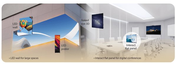 3D visuals, LED walls, and posters in hotel lobbies, presenting a range of information.